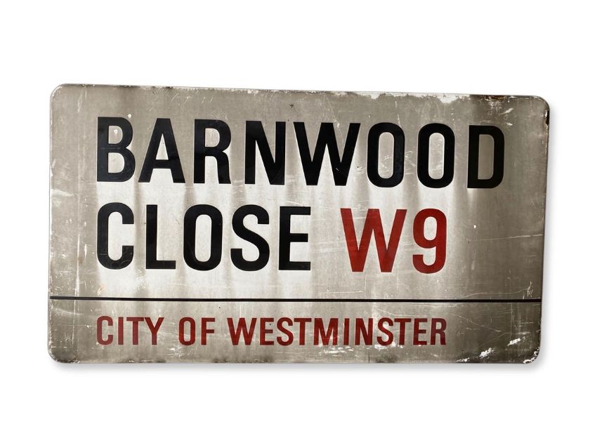 An enamelled iron street sign for Barnwood Close W9, City of Westminster