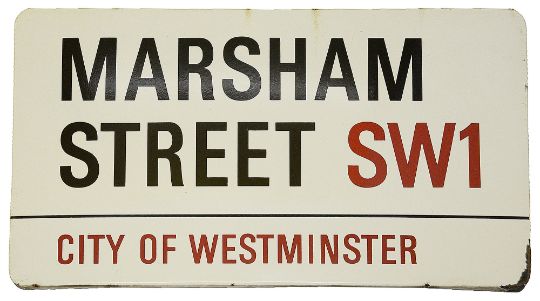An enamelled iron street sign for Marsham Street SW1,