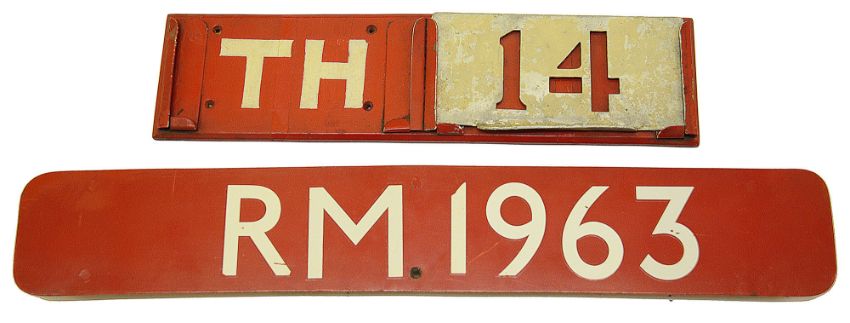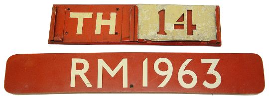 the first displaying 'RM 1963', white lettering on a red ground, the second displaying 'TH' for Thornton Heath garage and stencil '14', (2)