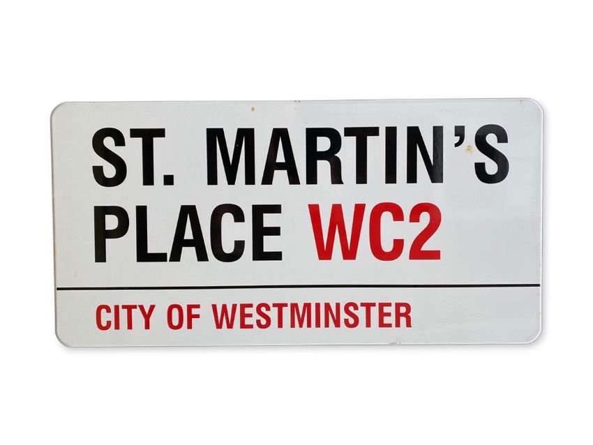 An enamelled iron street sign for St. Martin's Place WC2, City of Westminster with iconic black and red sans serif lettering first created by Sir Misha Black in 1967 which is unique to the Westminster signs and under copyright law, forbidden to be copied anywhere else in the world, sold together with a signed Certificate of Authenticity