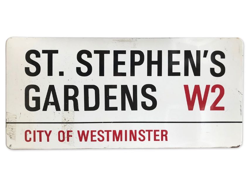 An enamelled iron street sign for St. Stephen's Gardens W2, City of Westminster