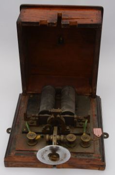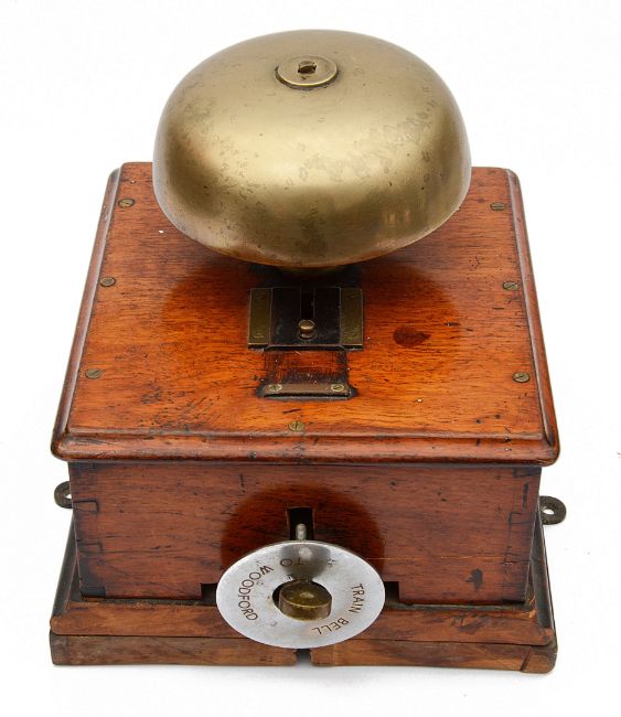 in mahogany case and large mushroom bell, with metal plaque stamped 'TRAIN BELL / TO WOODFORD',