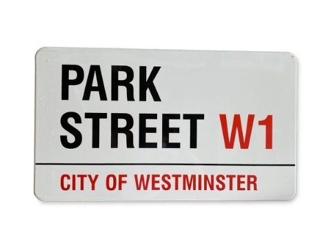An enamelled iron street sign for Park Street W1 City of Westminster with iconic black and red sans serif lettering first created by Sir Misha Black in 1967 which is unique to the Westminster signs and under copyright law, forbidden to be copied anywhere else in the world, sold together with a signed Certificate of Authenticity