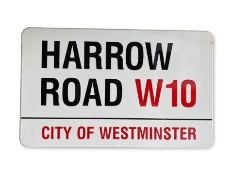 An enamelled iron street sign for Harrow Road W10, City of Westminster