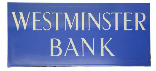 A Westminster Bank enamel coat of arms and nameplate sign,