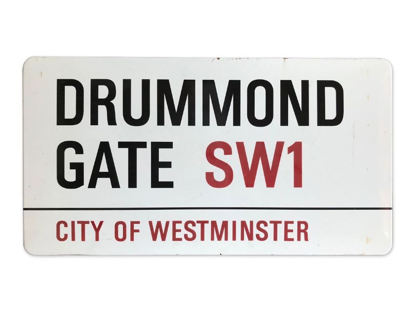 An enamelled iron street sign for Drummond Gate SW1, City of Westminster