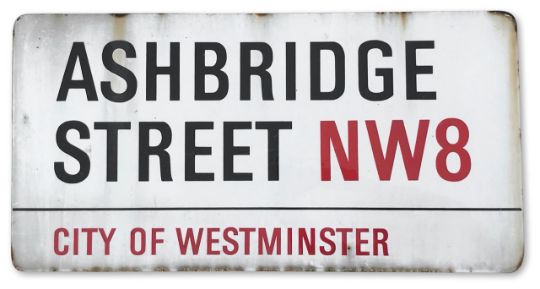 An enamelled iron street sign for Ashbridge Street NW8, City of Westminster with iconic black and red sans serif lettering first created by Sir Misha Black in 1967 which is unique to the Westminster signs and under copyright law, forbidden to be copied anywhere else in the world, sold together with a signed Certificate of Authenticity
