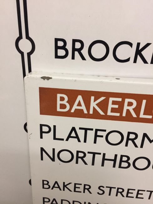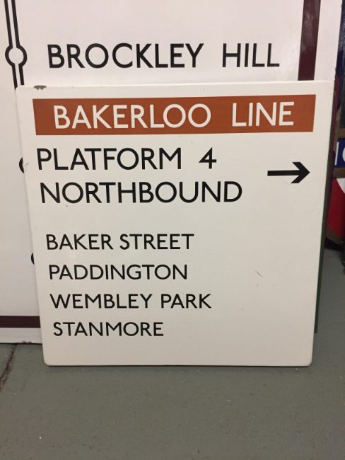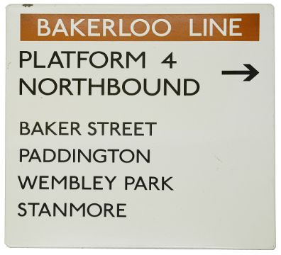 with arrow facing right and stations BAKER STREET, PADDINGTON, WEMBLEY PARK & STANMORE listed below, black letters on white ground, BAKERLOO LINE white letters on brown ground,