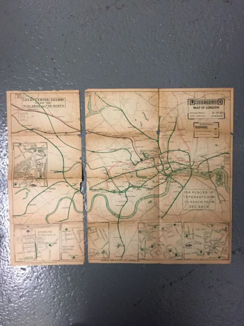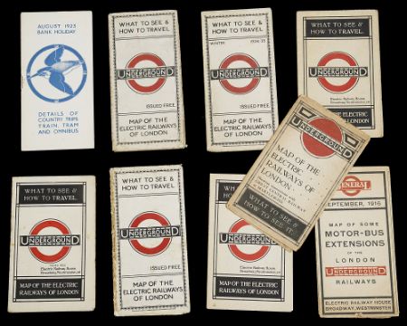 comprising a 1916 General Omnibus Map of some Motor-Bus Extensions, a c.1914-15 London Underground Map of the Electric Railways of London, two 1921 London Underground Map of the Electric Railways of London, issue date 9-3-21, a 1922 London Underground Map, issue number 1-3-22, a 1923 London Underground Map, issue number 1-1-23, a 1924 London Underground Map, issued June '24, a 1924/25 London Underground Map issued November '24 and a London Country August 1923 Bank Holiday timetable, (9)