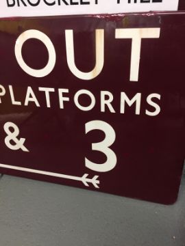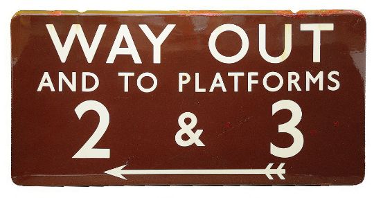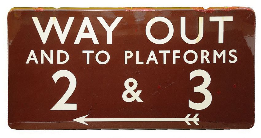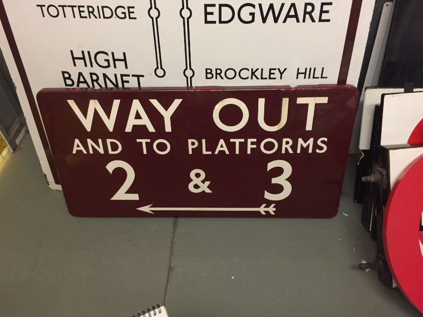 A BR(M) enamel sign displaying 'WAY OUT / AND TO PLATFORMS / 2 & 3',