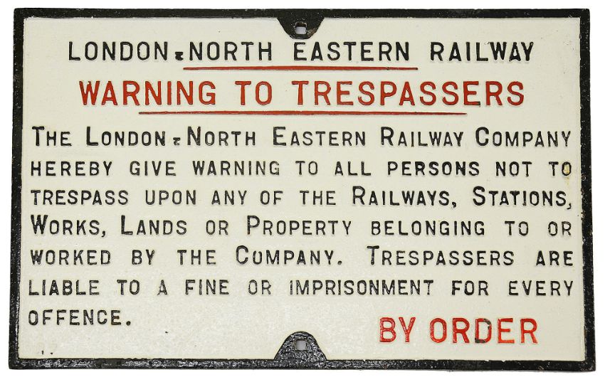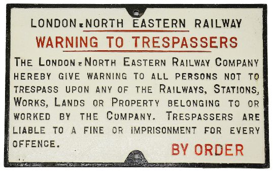 displaying 'WARNING TO TRESPASSERS', black and red lettering on a white ground in black border, drilled holes top and bottom for mounting