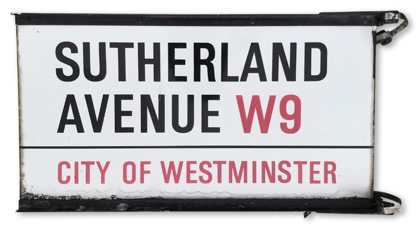 An enamelled iron street post sign for Sutherland Avenue W9, City of Westminster, double sided with iconic and black and red sans serif lettering first created by Sir Misha Black in 1967 which is unique to the Westminster signs and under copyright law, forbidden to be copied anywhere else in the world, sold together with a signed Certificate of Authenticity