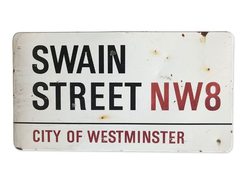 An enamelled iron street sign for Swain Street NW8, City of Westminster