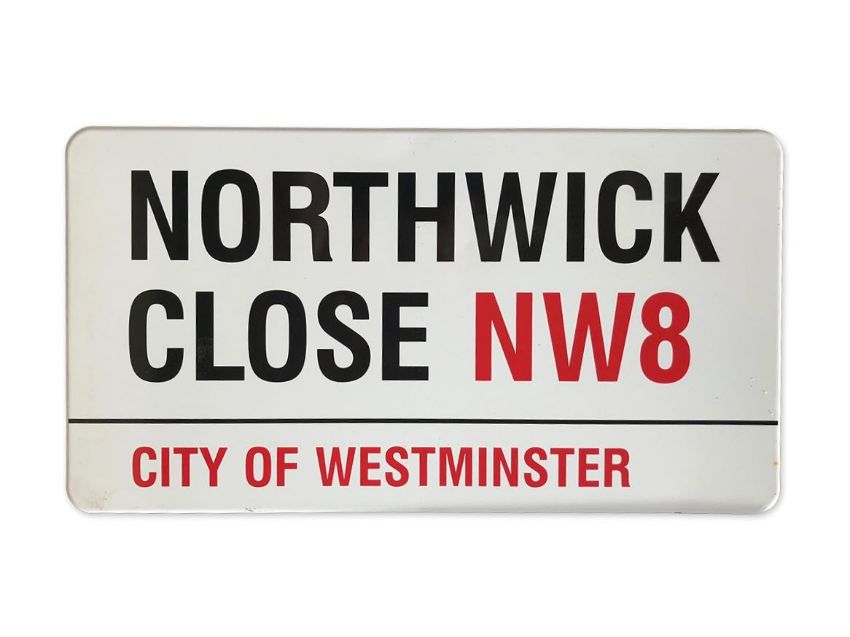 An enamelled iron street sign for Northwick Close NW8, City of Westminster