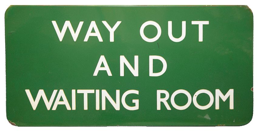 A BR(S) region enamel sign displaying 'WAY OUT AND WAITING ROOM',