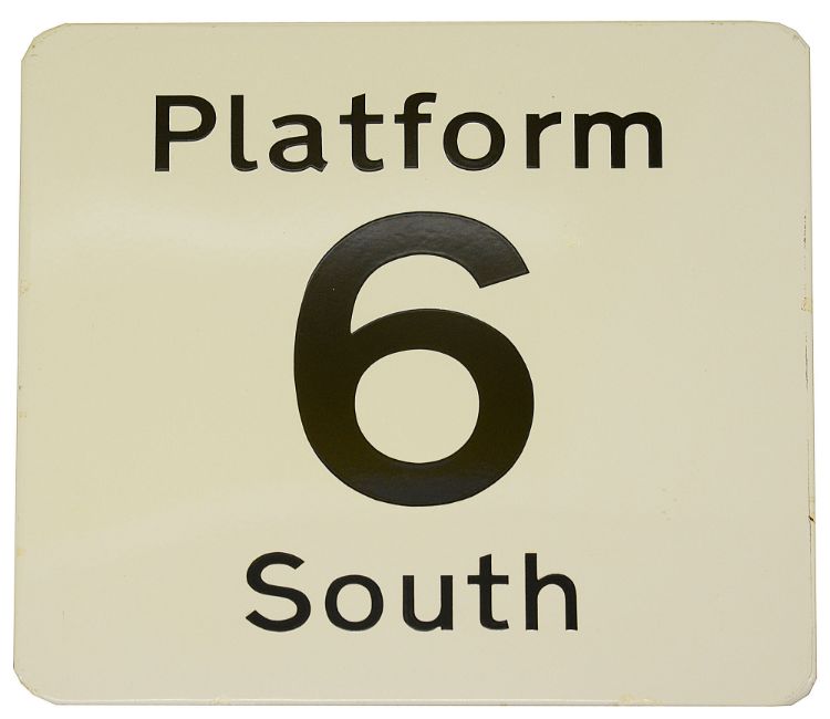 A railway station enamel sign displaying 'PLATFORM / 6 / SOUTH',