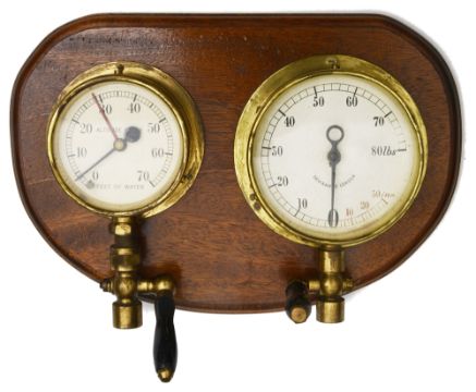 Two brass cased locomotive gauges and valves mounted on a mahogany board,