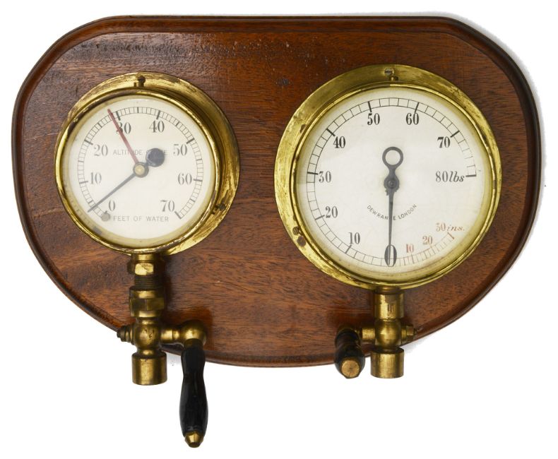 comprising an altitude gauge and a water pressure gauge manufactured by Dewrance London, bracket on back for wall mounting,