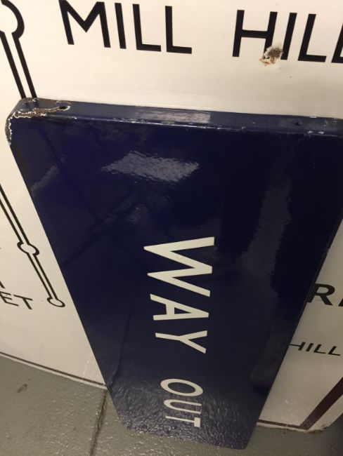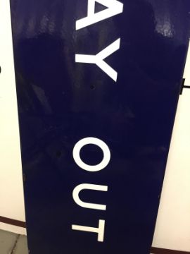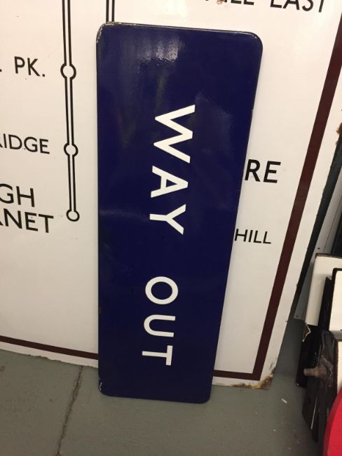 A BR(E) enamel sign displaying 'WAY OUT'