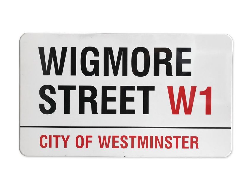 An enamelled iron street sign for Wigmore Street W1, City of Westminster