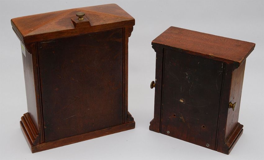 the first single dial with pedimented case and applied plaque stamped 'UP LINE', the second with single dial brass plaque stamped 'UP LINE', (2)