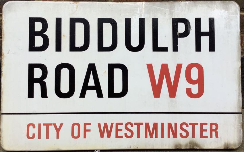 An enamelled iron street sign for Biddulph Road W9, City of Westminster, with iconic black and red sans serif lettering first created by Sir Misha Black in 1967 which is unique to the Westminster signs and under copyright law, forbidden to be copied anywhere else in the world, sold together with a signed Certificate of Authenticity