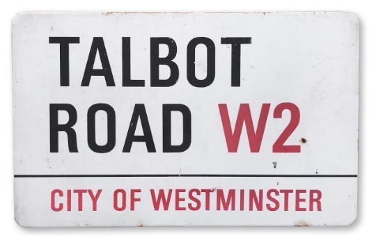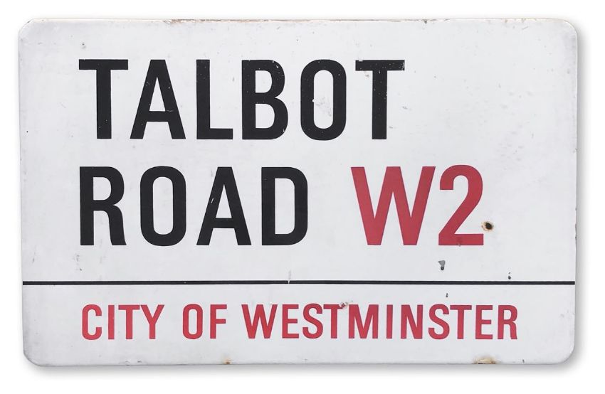 An enamelled iron street sign for Talbot Road W2, City of Westminster, on wooden frame to back, with iconic and black and red sans serif lettering first created by Sir Misha Black in 1967 which is unique to the Westminster signs and under copyright law, forbidden to be copied anywhere else in the world, sold together with a signed Certificate of Authenticity