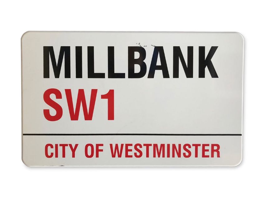 An enamelled iron street sign for Millbank SW1, City of Westminster with iconic black and red sans serif lettering first created by Sir Misha Black in 1967 which is unique to the Westminster signs and under copyright law, forbidden to be copied anywhere else in the world, sold together with a signed Certificate of Authenticity