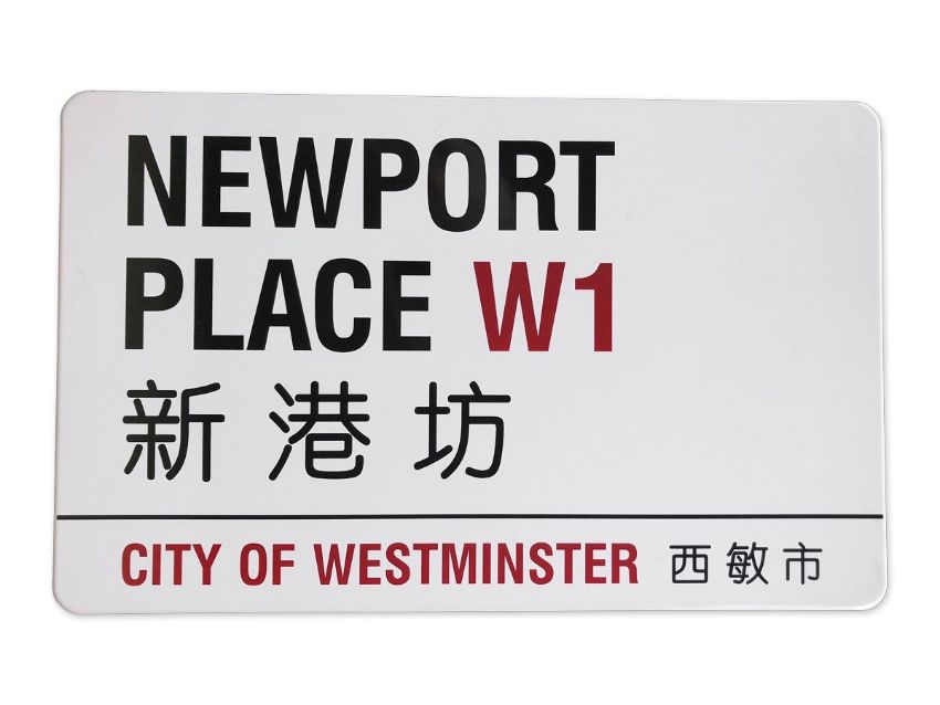 An enamelled iron street sign for Newport Place Chinatown W1, City of Westminster