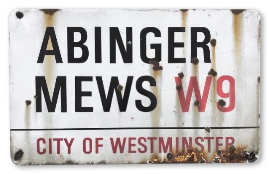 An enamelled iron street sign for Abinger Mews W9, City of Westminster, with iconic and black and red sans serif lettering first created by Sir Misha Black in 1967 which is unique to the Westminster signs and under copyright law, forbidden to be copied anywhere else in the world, sold together with a signed Certificate of Authenticity
