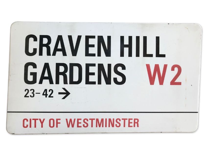 An enamelled iron street sign for Craven Hill Gardens 23-42 W2, City of Westminster