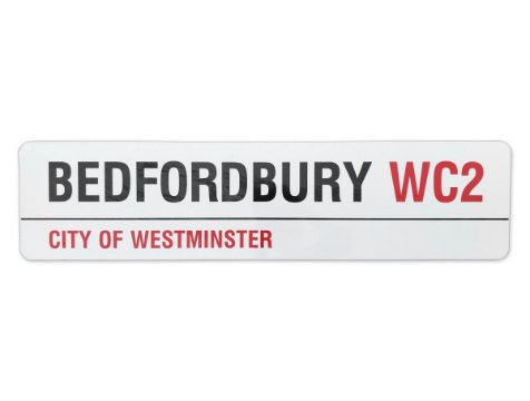 An enamelled iron street sign for Bedfordbury WC2, City of Westminster with iconic black and red sans serif lettering first created by Sir Misha Black in 1967 which is unique to the Westminster signs and under copyright law, forbidden to be copied anywhere else in the world, sold together with a signed Certificate of Authenticity