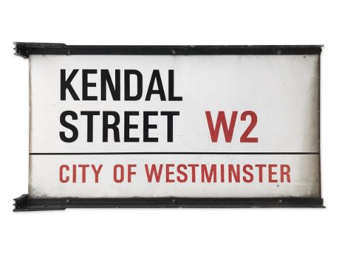 A double sided enamelled street sign on brackets for Kendal Street W2, City of Westminster
