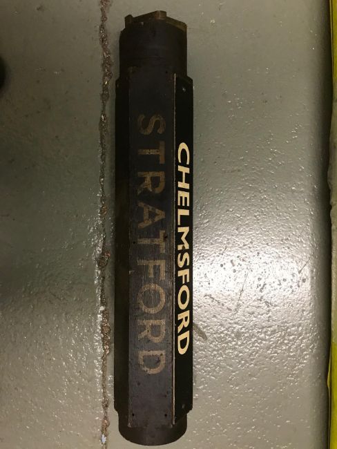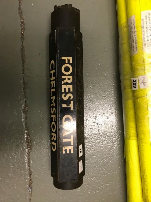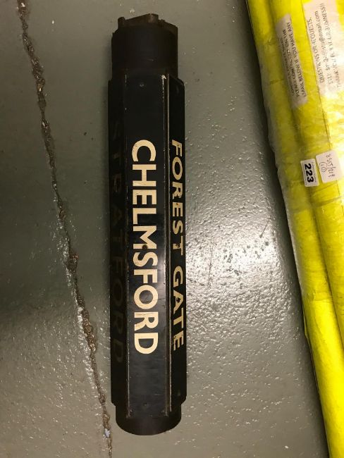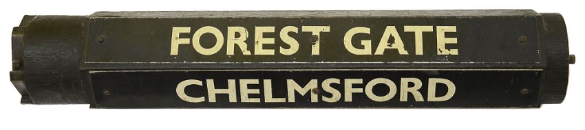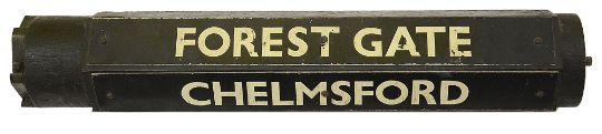 including stations 'Forest Gate' and 'Chelmsford', enamel signs mounted on wooden core with brass rotating plate at one end,