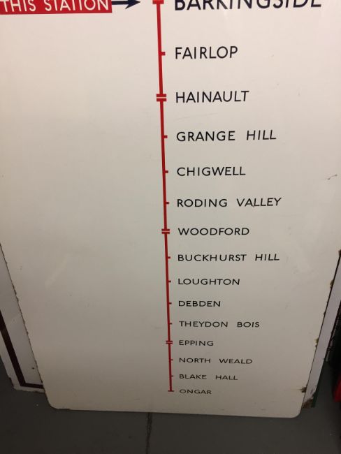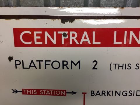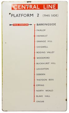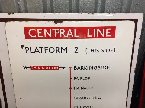 A large London Underground enamel directional sign for the Central Line from Barkingside station,