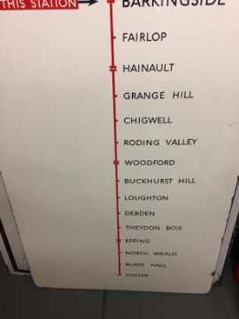 displaying 'CENTRAL LINE / PLATFORM 2 (THIS SIDE), a double-flighted arrow facing right indicating 'THIS STATION', showing the Central line route, including the now closed section between Epping and Ongar