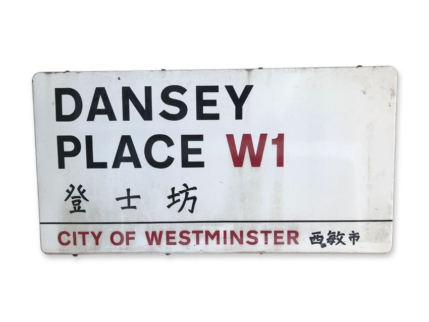 An enamelled iron street sign for Dansey Place W1 Chinatown, City of Westminster