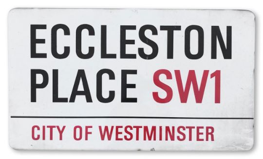 An enamelled iron street sign for Eccleston Place SW1, City of Westminster, with iconic and black and red sans serif lettering first created by Sir Misha Black in 1967 which is unique to the Westminster signs and under copyright law, forbidden to be copied anywhere else in the world, sold together with a signed Certificate of Authenticity