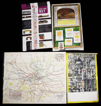 comprising a 1960 'Your New Met' poster designed by William Fenton, a 1958 'London Rovers' (blank) and 1963 Underground Centenary poster designed by Peter Roberson, a large colour printed map of the London & Suburbs Main Line Railways on paper, dated 1947, a folding 1893 map 'The "District Railway" Miniature Map of London', and a 'London United Electric Tramways in Connection with Metropolitan District Railway and Allied Lines Diagram showing stations, existing fares and mileage', (6)