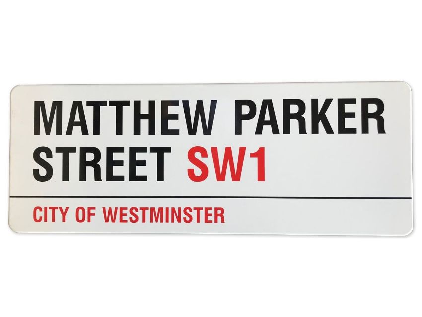 An enamelled iron street sign for Matthew Parker Street SW1, City of Westminster