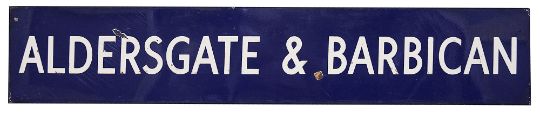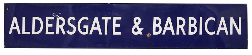 A London Underground enamel station sign for Aldersgate & Barbican,
