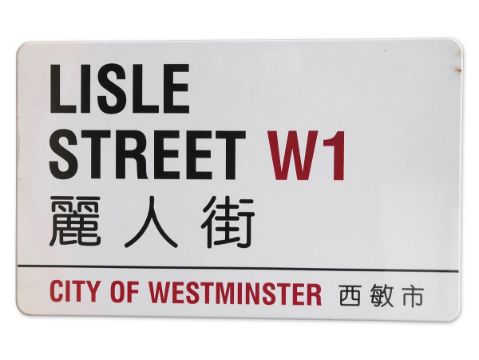 An enamelled iron street sign for Lisle Street W1, City of Westminster