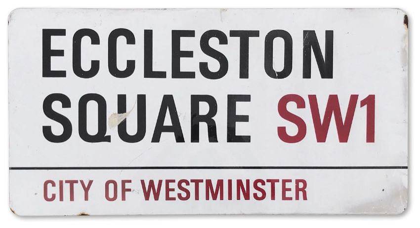 An enamelled iron street sign for Eccleston Square SW1, City of Westminster with iconic black and red sans serif lettering first created by Sir Misha Black in 1967 which is unique to the Westminster signs and under copyright law, forbidden to be copied anywhere else in the world, sold together with a signed Certificate of Authenticity