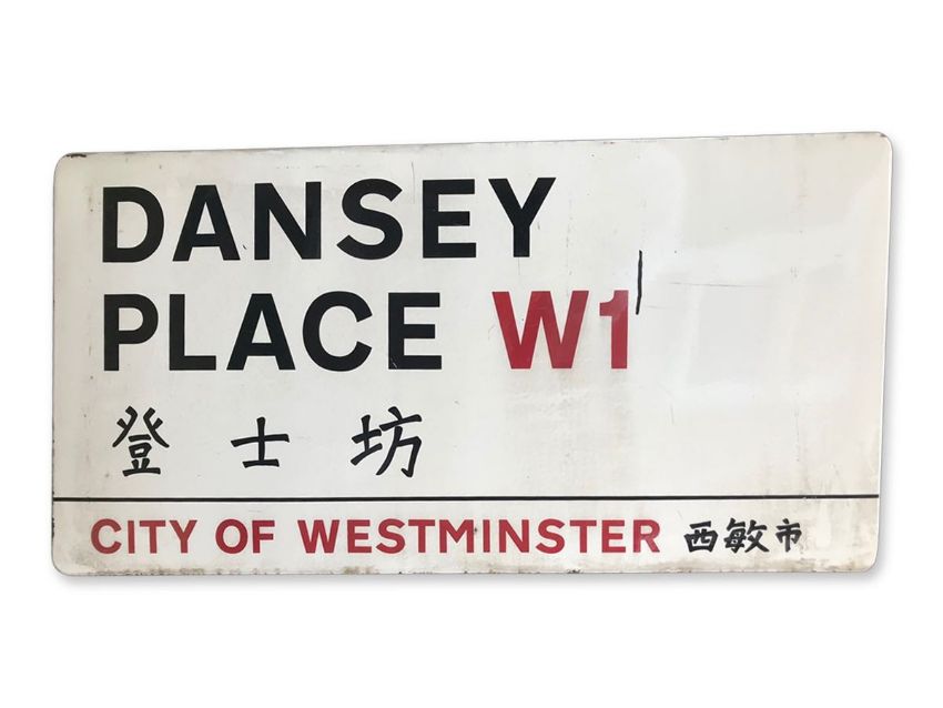 An enamelled iron street sign for Dansey Place W1 Chinatown, City of Westminster