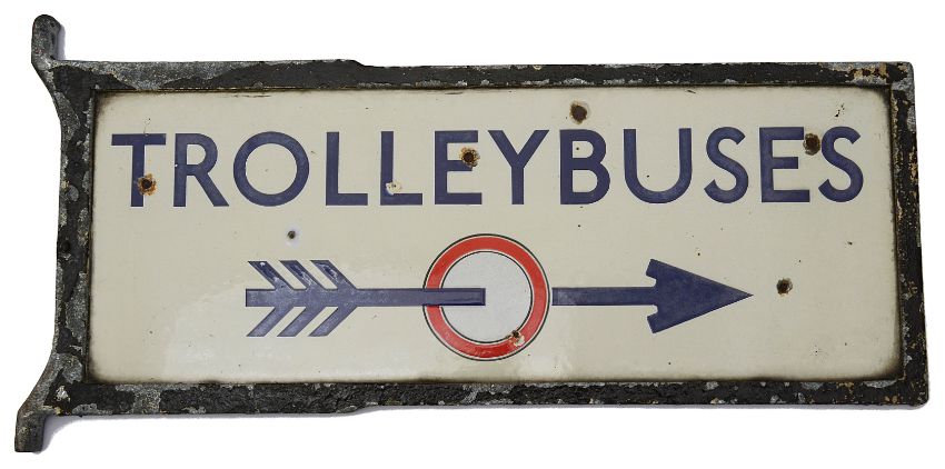 A c.1930s London Underground enamel direction sign displaying 'TROLLEYBUSES',