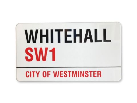 An enamelled iron street sign for Whitehall SW1, City of Westminster with iconic black and red sans serif lettering first created by Sir Misha Black in 1967 which is unique to the Westminster signs and under copyright law, forbidden to be copied anywhere else in the world, sold together with a signed Certificate of Authenticity