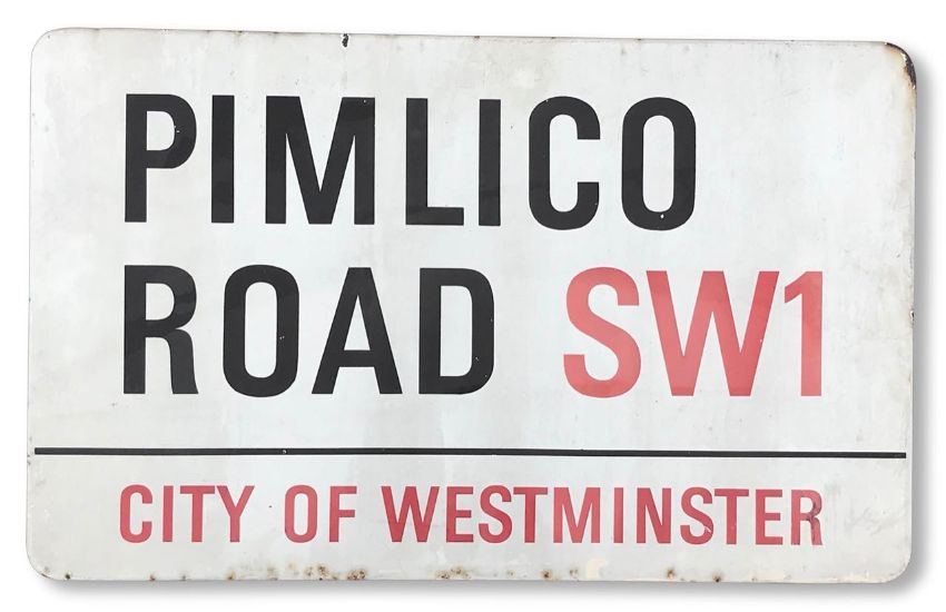 An enamelled iron street sign for Pimlico Road SW1, City of Westminster, with iconic and black and red sans serif lettering first created by Sir Misha Black in 1967 which is unique to the Westminster signs and under copyright law, forbidden to be copied anywhere else in the world, sold together with a signed Certificate of Authenticity