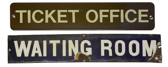 Two railway station enamel doorplate signs displaying 'TICKET OFFICE' and 'WAITING ROOM',