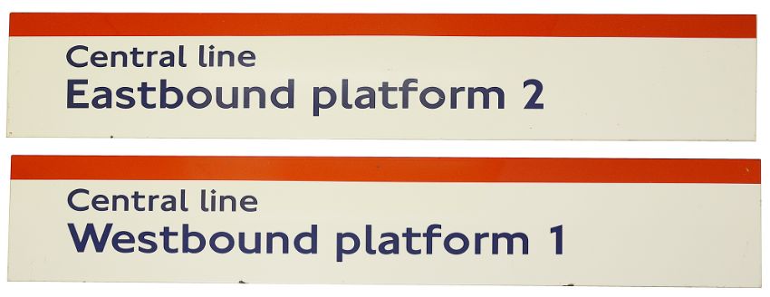 Two London Underground enamel station frieze signs displaying 'Central line / Westbound platform 1' and 'Central line / Eastbound platform 2',