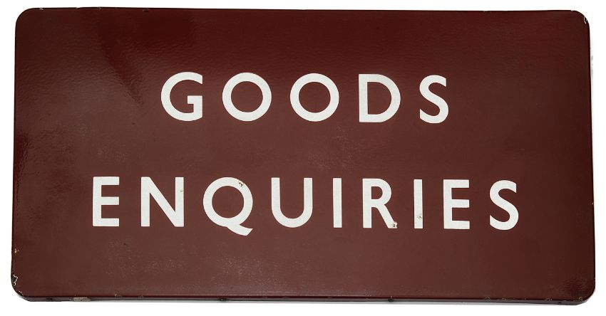 A BR(M) enamel sign displaying 'GOODS ENQUIRIES',